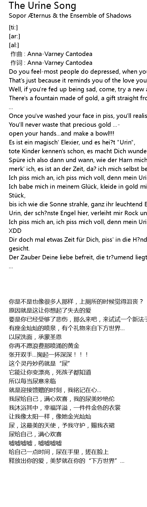 | [03:35.70] | Ich piss mich an, ich piss mich voll, denn mein Urin ist wundervoll!! |