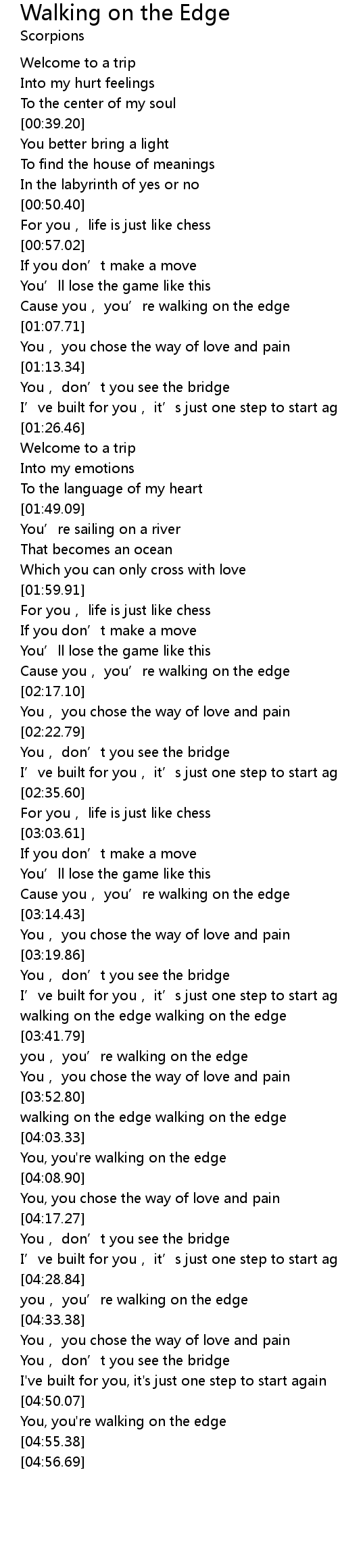 | [01:02.58] | Cause you, you' re walking on the edge |