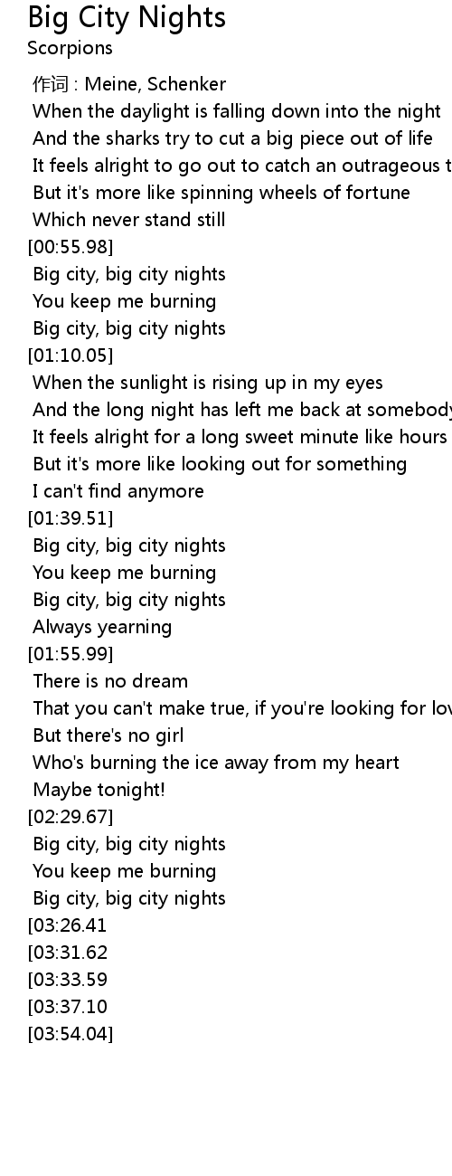 | [03:47.66][03:33.59][03:19.30] | Big city, big city nights |