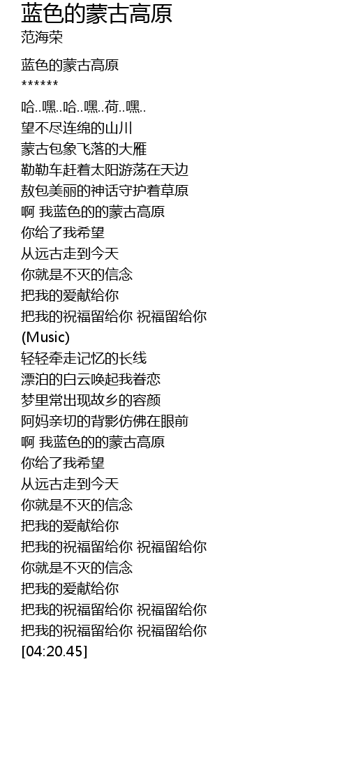 | [03:16.66] | 啊 我蓝色的的蒙古高原 |