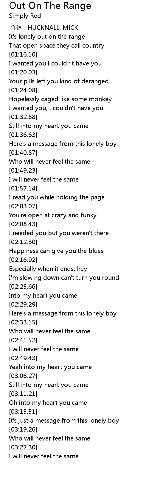 | [00:00.00] | 作词 : HUCKNALL, MICK |