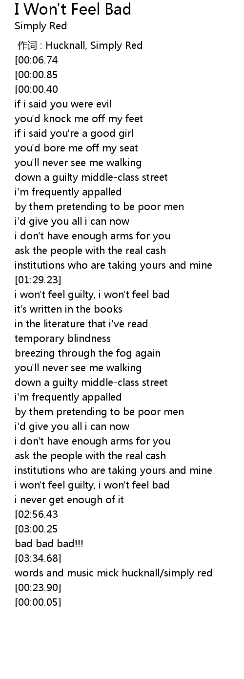 | [03:06.15][02:56.43] | i won' t feel guilty, i won' t feel bad |