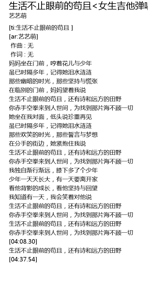 | Song | 生活不止眼前的苟且<女生吉他弹唱版> |