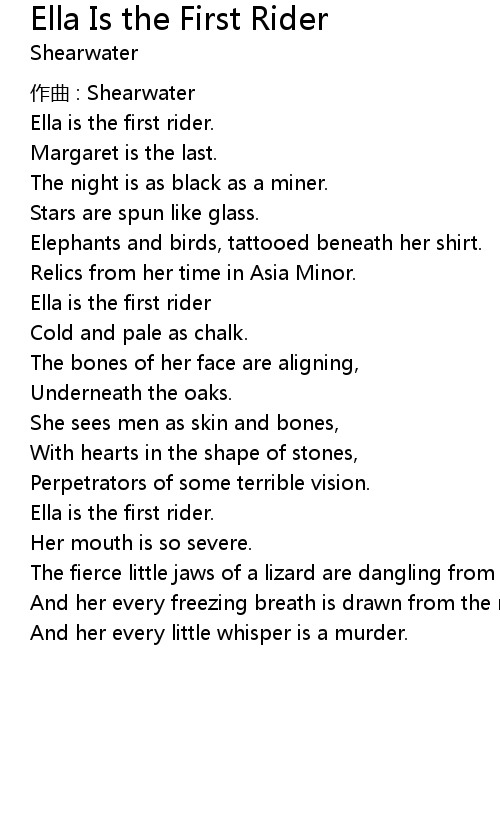 | Song | Ella Is the First Rider |