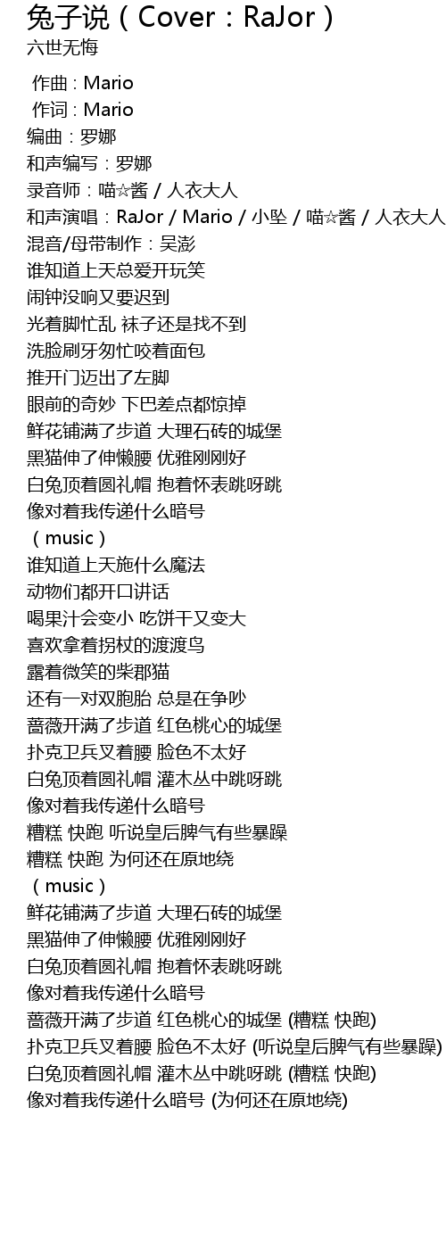 | [00:08.88] | 和声演唱:RaJor / Mario / 小坠 / 喵☆酱 / 人衣大人 |