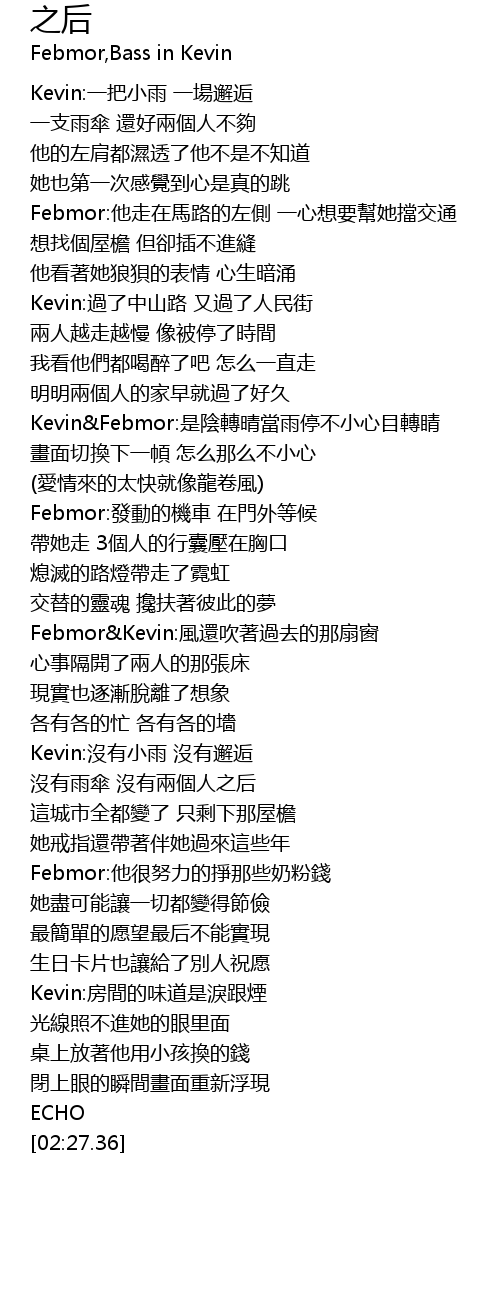 | [00:50.60] | Kevin&Febmor:是陰轉晴當雨停不小心目轉睛 |