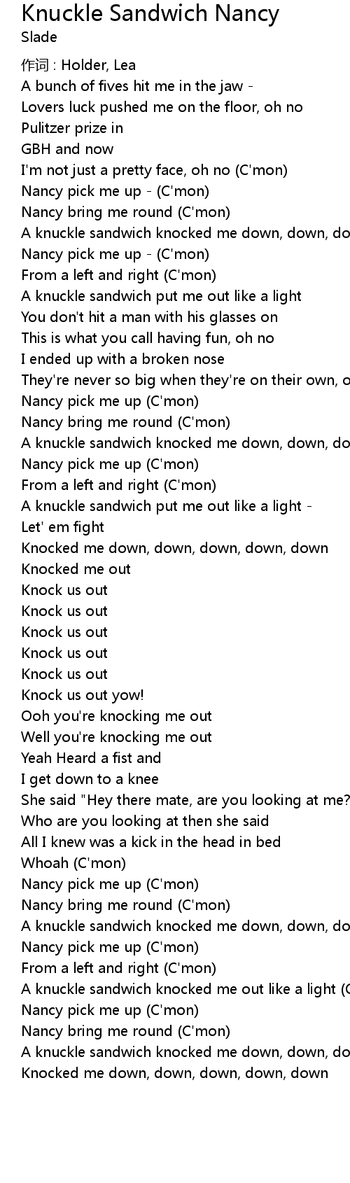 | A knuckle sandwich knocked me down, down, down C' mon | |