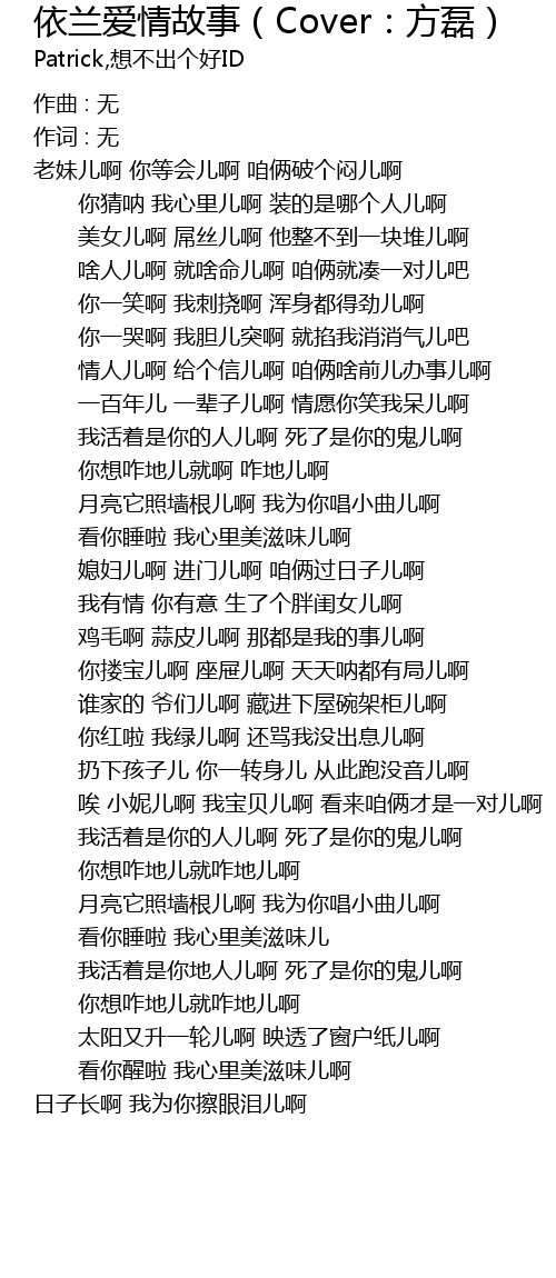 | 月亮它照墙根儿啊 我为你唱小曲儿啊 | |