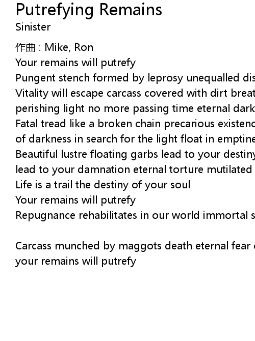 | Carcass munched by maggots death eternal fear crypts of death pang of conscience your remains will putrefy |