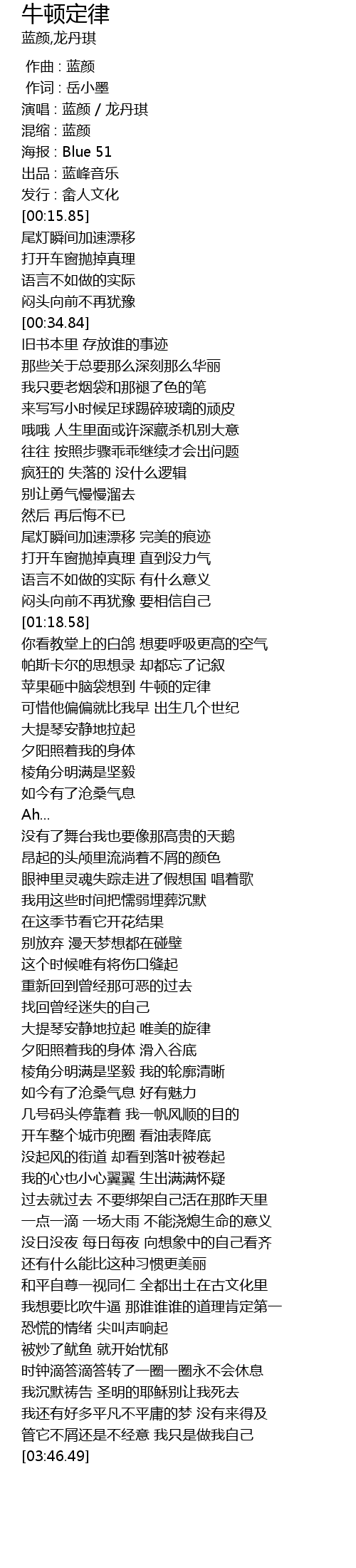 | [01:32.68] | 苹果砸中脑袋想到 牛顿的定律 |