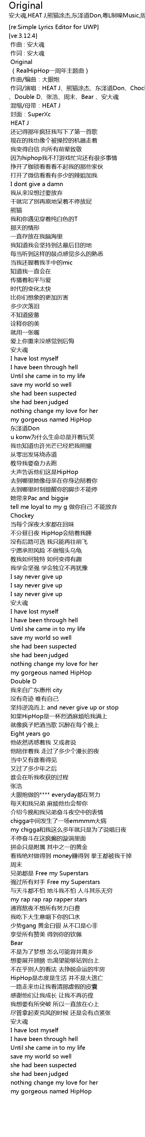 | [00:13.76] | 作词/演唱:HEAT J、熊猫涂杰、东泽道Don、Chockey 、Double D、张浩、周末、Bear 、安大魂 |