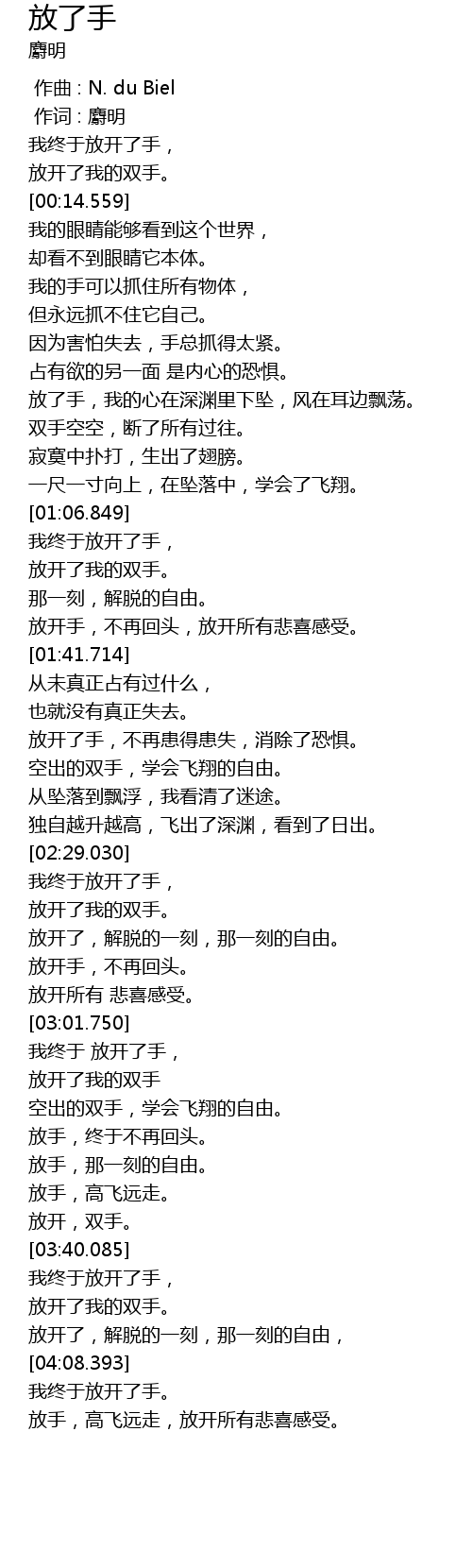 | [03:55.867] | fàng kāi le wǒ de shuāng shǒu. |
