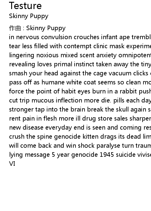 | in nervous convulsion crouches infant ape trembling in mothers shit cage eyes tear less filled with contempt clinic mask experiment with life and death smell lingering noxious mixed scent anxiety omnipotent doctor grinds the cage door revealing loves primal instinct taken away the tiny face terrified rant and rave smash your head against the cage vacuum clicks on high conscious of the pain pass off as humane white coat seems so clean most dirt bleached out of greed force the point of habit eyes burn in a rabbit push the pain test button spines cut trip mucous inflection more die. pills each day what goes around comes back stronger tap into the brain break the skull again smash price research rat lab rent pain in flesh more ill drug store sales sharpen the knife emphasis on money new disease everyday end is seen and coming reseach turns it' s back to gain crush the spine genocide kitten drags its dead limb continuing all suffering it will come back and win shock paralyse turn trauma burns out the will to live the lying message 5 year genocide 1945 suicide vivisect | |