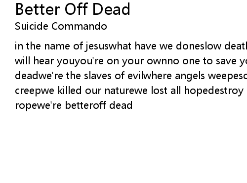 | in the name of jesuswhat have we doneslow death & diseaseswe're on the runno one will hear youyou're on your ownno one to save youwe all die alonewe're betteroff deadwe're the slaves of evilwhere angels weepescape from my hellyou fucking creepwe killed our naturewe lost all hopedestroy my creaturewhere is the ropewe're betteroff dead |