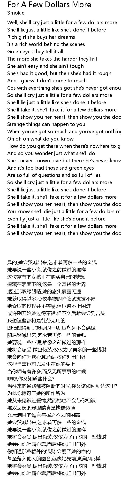 | [00:05.67] | Well, she'll cry just a little for a few dollars more |