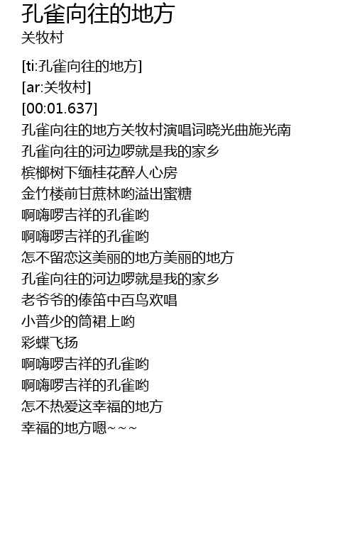 | [00:08.154] | 孔雀向往的地方关牧村演唱词晓光曲施光南 |