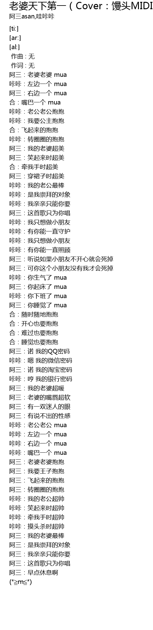 | [00:05.77] | 阿三:老婆老婆 mua |