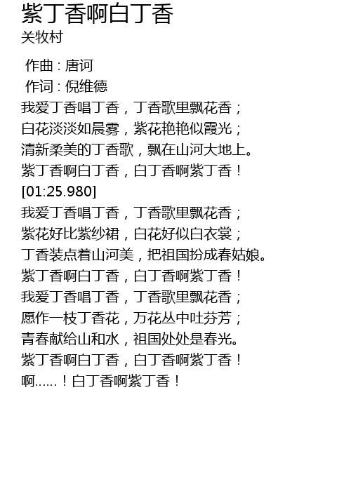 | [01:44.230] | 我爱丁香唱丁香,丁香歌里飘花香; |