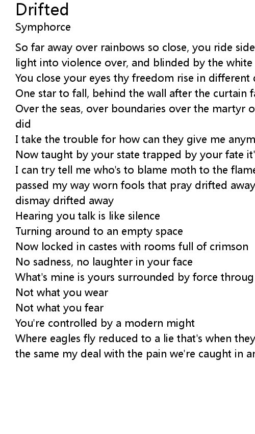 I can try tell me who's to blame moth to the flame swollowed now up my soul time passed my way worn fools that pray drifted away your laughter stays through my dismay drifted away |