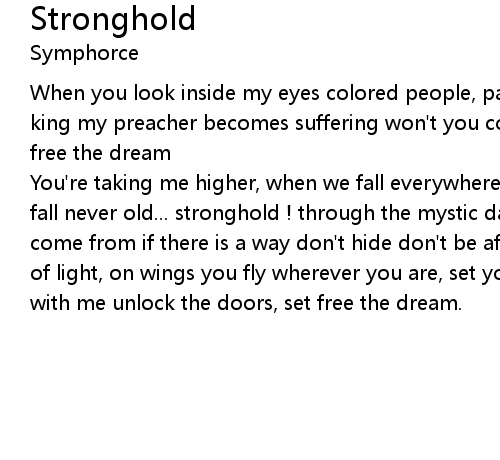 | You're taking me higher, when we fall everywhere never feel never cold never fall never old... stronghold ! through the mystic dawn another world, where you come from if there is a way don't hide don't be afraid across the sky the rays of light, on wings you fly wherever you are, set your soul free won't you come with me unlock the doors, set free the dream. |