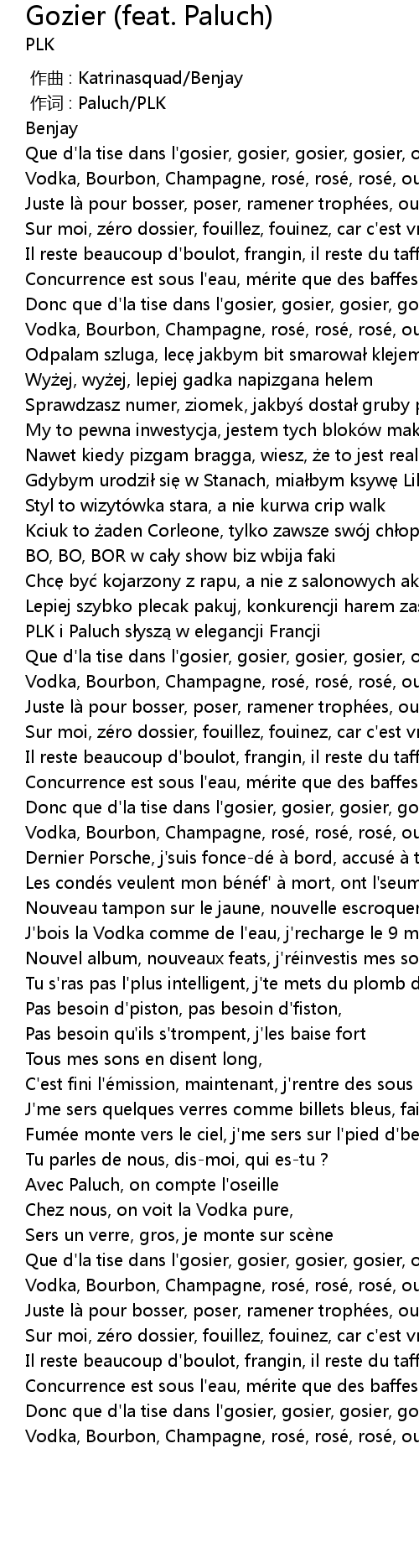 | [01:31.35] | Donc que d'la tise dans l'gosier, gosier, gosier, gosier, ouais, hey |