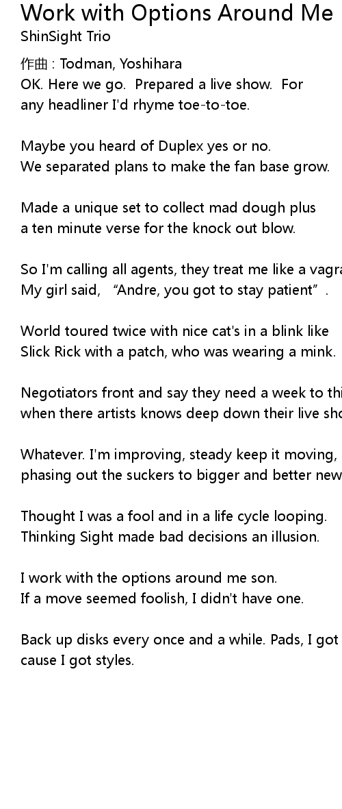 | Song | Work with Options Around Me |