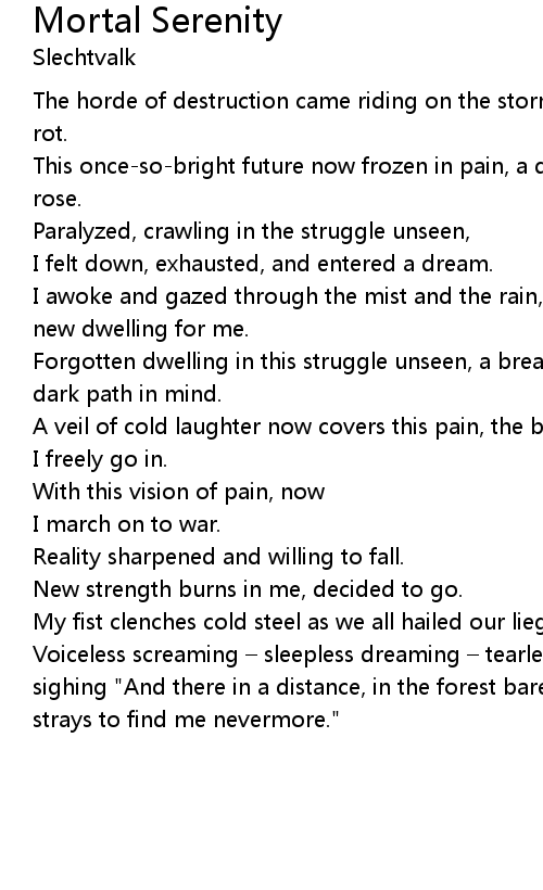 | Voiceless screaming – sleepless dreaming – tearless crying – breathless sighing "And there in a distance, in the forest bare and cold, the pale beauty strays to find me nevermore." |