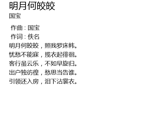 | [00:43.955] | 出户独彷徨,愁思当告谁。 |
