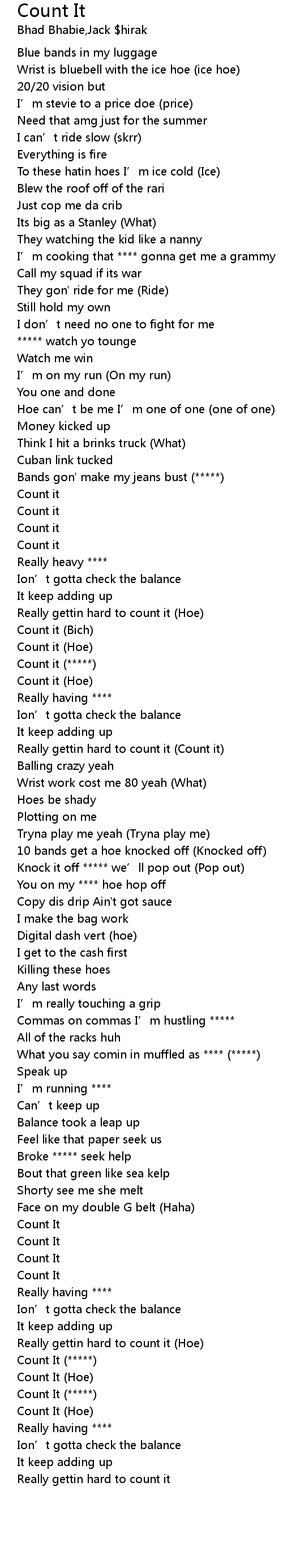 | [01:00.29] | Count it Hoe |