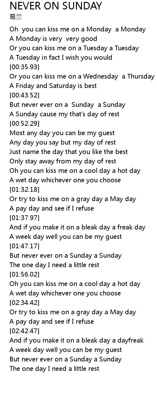 | [00:44.85] | But never ever on a Sunday a Sunday |