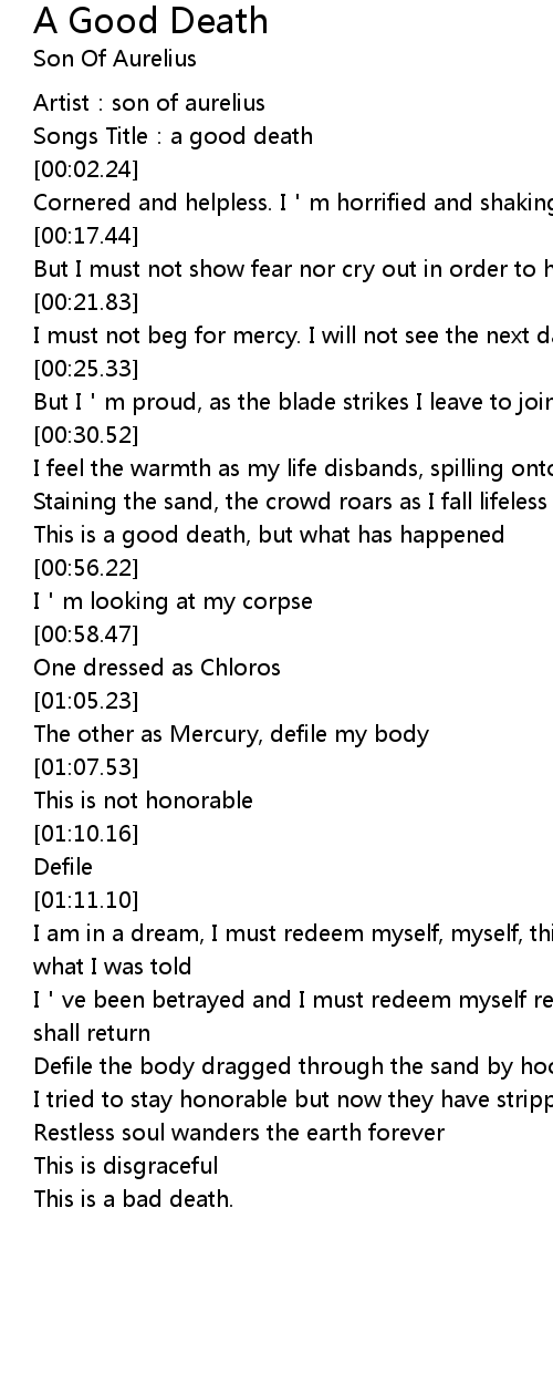 | [00:53.29] | Staining the sand, the crowd roars as I fall lifeless and silent |