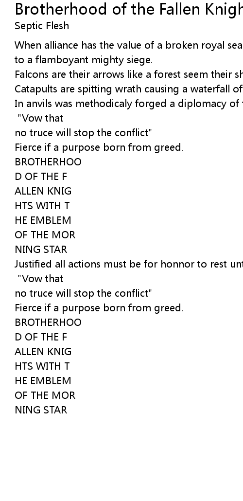 A plot has provided the rope to hang the bloody flag of war. [Chorus:] "Vow that no truce will stop the conflict"