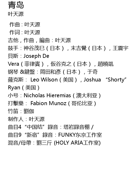 | [00:28.000] | 曲目4“中国结”錄音:塔岩錄音棚 / 曲目9“新宿”錄音:FUNKY东京工作室 |