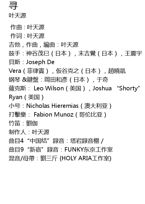 | [00:28.000] | 曲目4“中国结”錄音:塔岩錄音棚 / 曲目9“新宿”錄音:FUNKY东京工作室 |