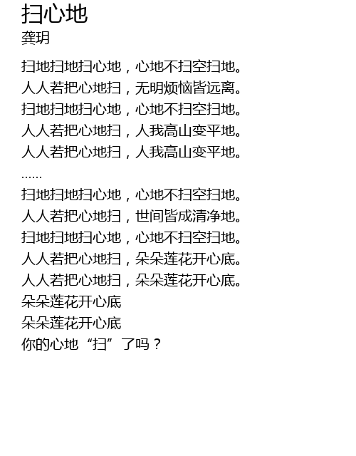 | [02:23.736] | 扫地扫地扫心地,心地不扫空扫地。 |
