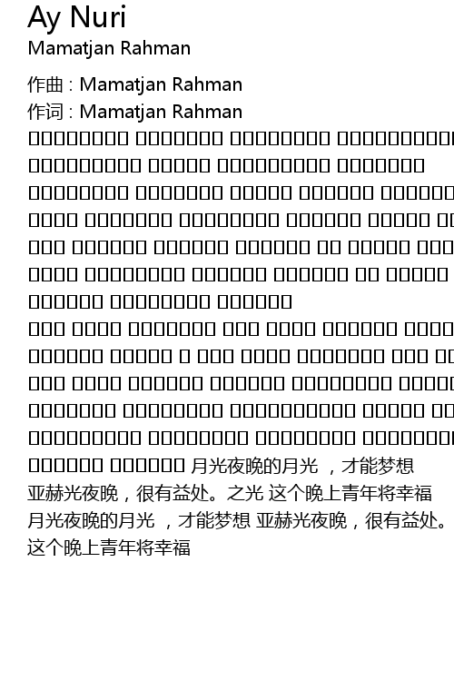 | ئاي نۇرى كىچىلەر ئاي نۇرى ئايخا قاراب قىلسام ئارزۇ ياخ نۇرى كىچىلەر ياخ نۇرى بۇ كىچە ياشلار بۇلسۇن بەخىتلىك قىينايدۇ سىخىنىش قىينايدۇ يىقىمىلىق گۈزەل بىر ناۋا كۈيلەيدۇ دىللاردا كۈيلەيدۇ كۆزلەردە سىخنىش ھەسرەت 月光夜晚的月光 ,才能梦想 亚赫光夜晚,很有益处。之光 这个晚上青年将幸福 月光夜晚的月光 ,才能梦想 亚赫光夜晚,很有益处。之光 这个晚上青年将幸福 |