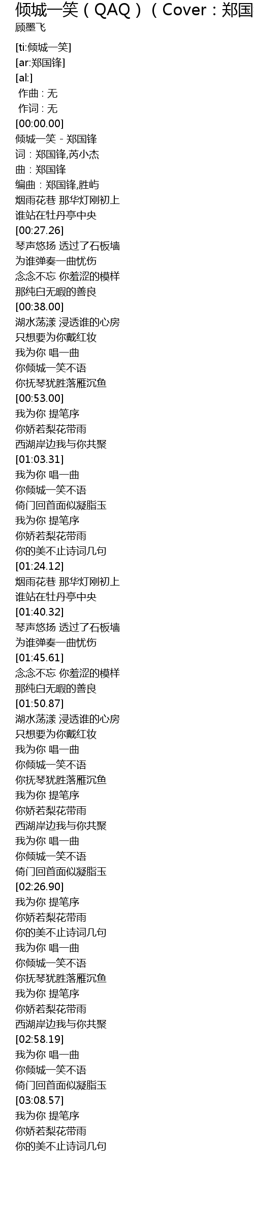 | [00:00.92] | 倾城一笑 - 郑国锋 |