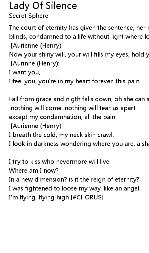 The court of eternity has given the sentence, her mistery lives in the eyes of blinds, condamned to a life without light where love lives at the borders of reality [PRE CHORUS:] [Aurienne (Henry):] |