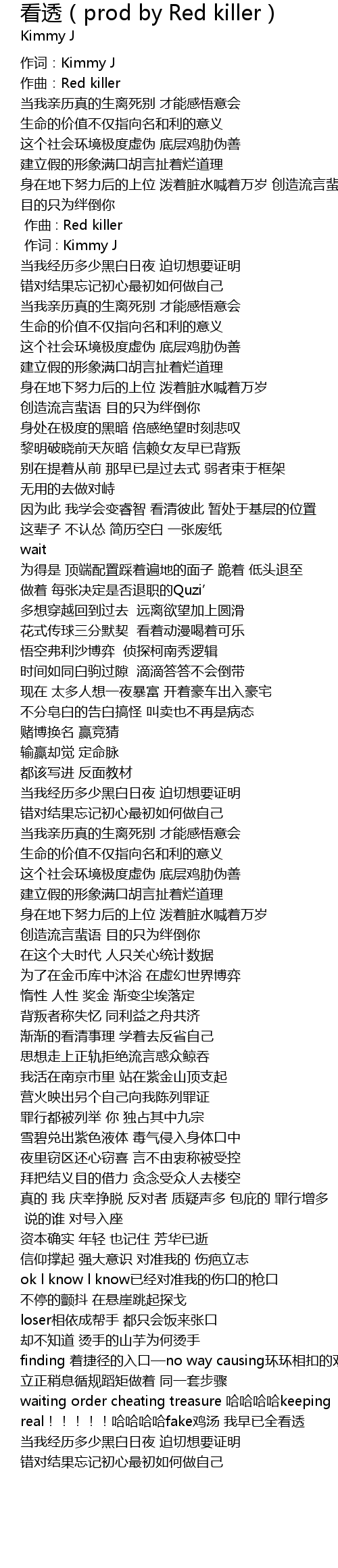 | [03:06.000] | waiting order cheating treasure 哈哈哈哈keeping real!!!!!哈哈哈哈fake鸡汤 我早已全看透 |