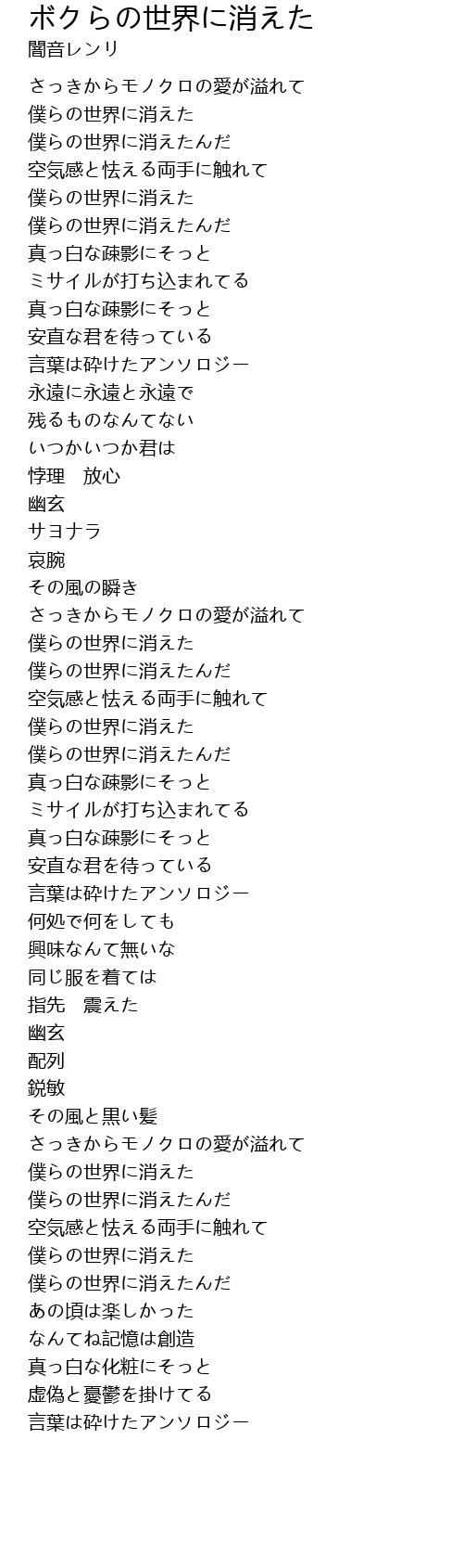 | [00:12.43] | 僕らの世界に消えたんだ |