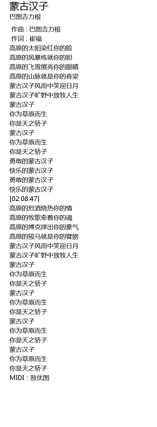 | [01:47.35] | 勇敢的蒙古汉子 |