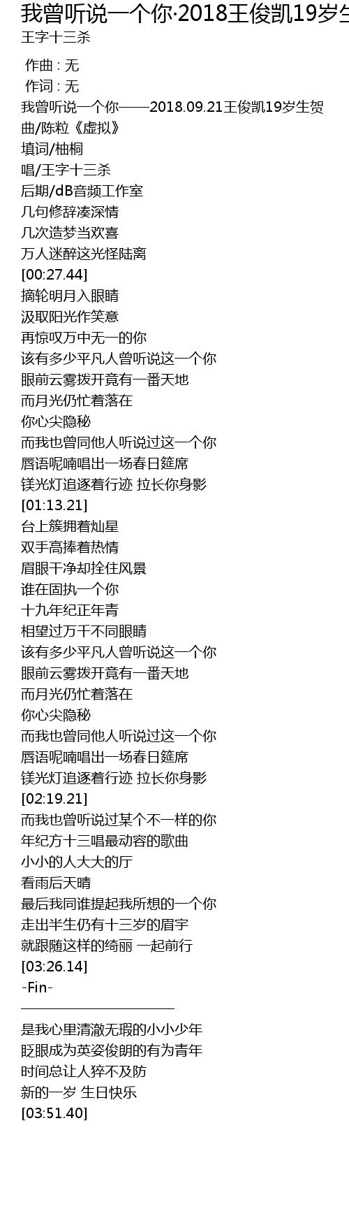 | [00:01.57] | 我曾听说一个你——2018.09.21王俊凯19岁生贺 |