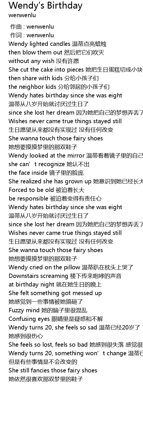 | [01:45.000] | Wendy hates birthday since she was eight 温蒂从八岁开始就讨厌过生日了 |