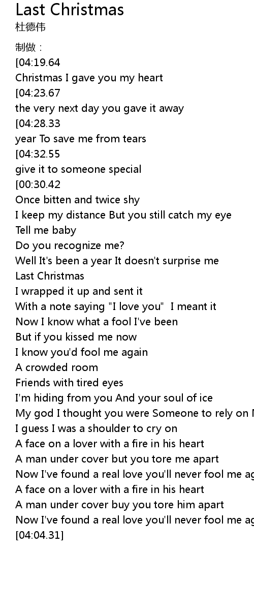 | [04:36.83][04:19.64][03:26.76][03:08.61][01:58.56][01:41.06][00:48.10][00:05.81] | Last Christmas I gave you my heart |