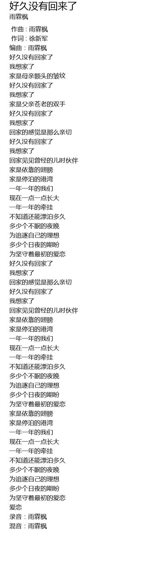 | [00:39.58] | hǎo jiǔ méi yǒu huí jiā le |