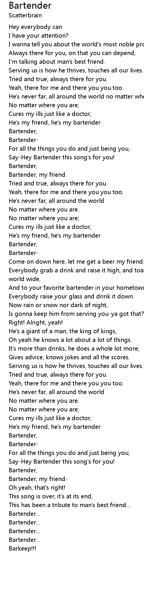 Everybody grab a drink and raise it high, and toast the bartenders of the whole world wide, |