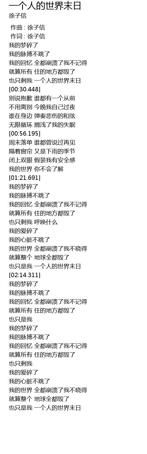 | [00:17.701] | 也只剩我 一个人的世界末日 |