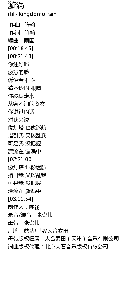 | [03:20.93] | 母带版权归属:太合麦田(天津)音乐有限公司 |