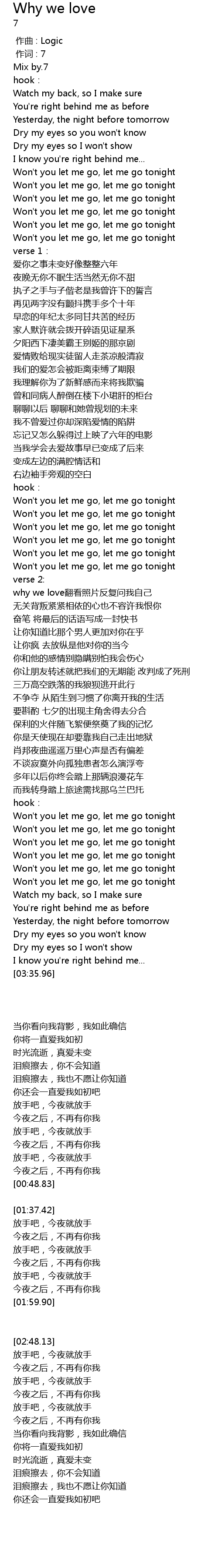 | [01:38.38] | Won't you let me go, let me go tonight |