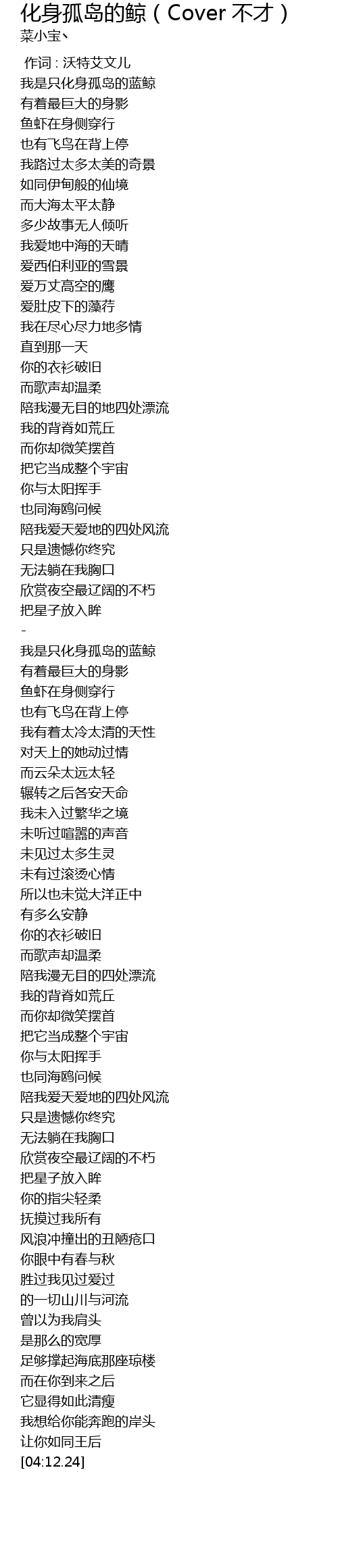 | [02:02.96] | 我是只化身孤岛的蓝鲸 |